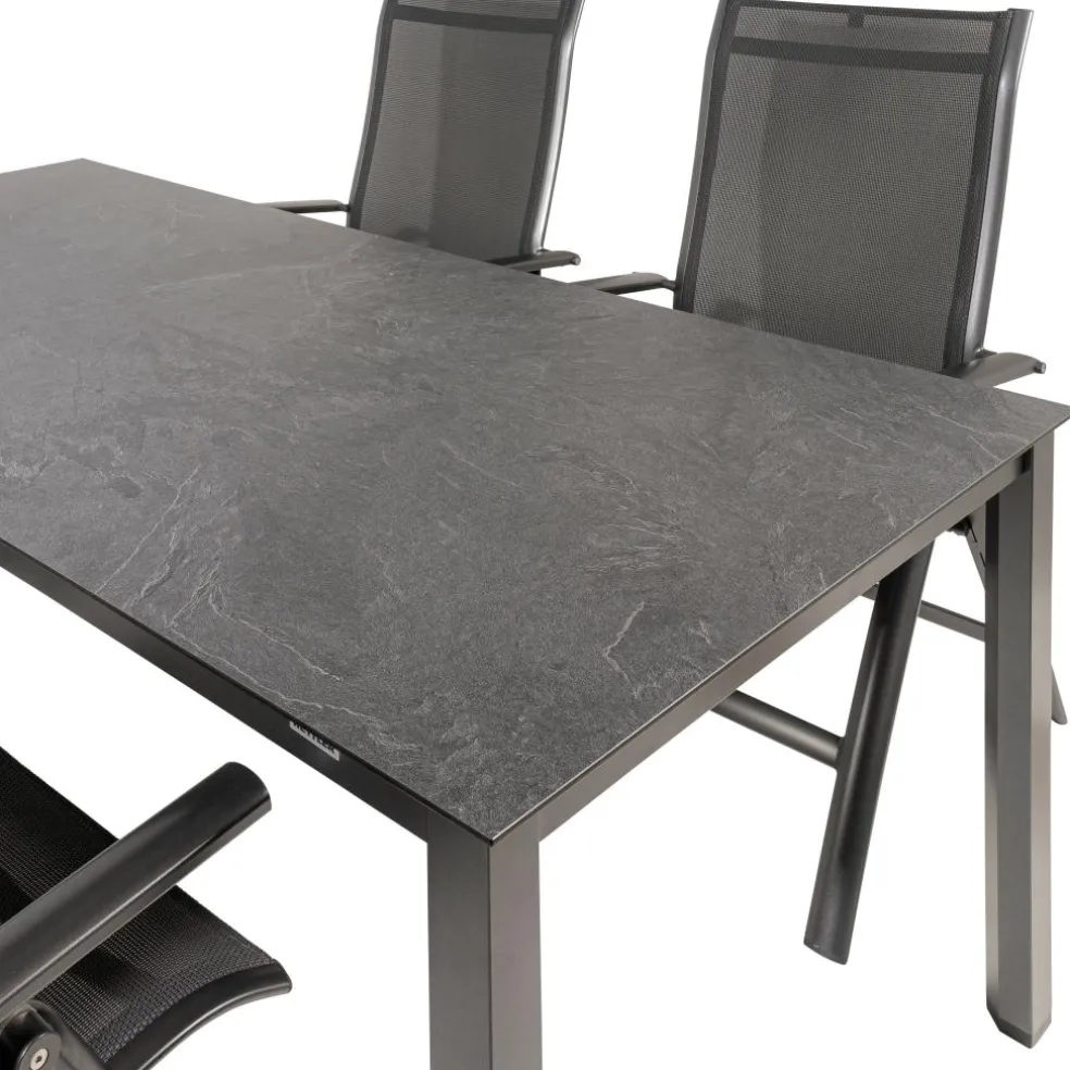De Kettler HPL 180 Legato 4 verstelbaar tuinset jura antraciet omvat een tuintafel en vier Legato Curve verstelbare tuinstoelen. De HPL tuintafel is vervaardigd van High Pressure Laminate met een aluminium onderstel, wat duurzaamheid en eenvoudig onderhoud biedt. Het moderne design met lichte constructie is bestand tegen diverse weersomstandigheden en UV-straling, wat zorgt voor langdurige kwaliteit. De Legato Curve tuinstoelen zijn comfortabel en weerbestendig, met vier verstelbare posities. Ze hebben een aluminium frame en een zitting en rugleuning van textileen, waardoor ze zeer onderhoudsvriendelijk zijn.