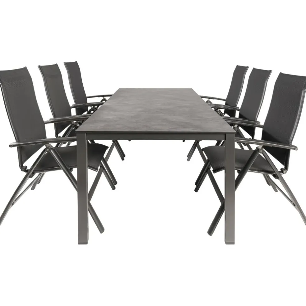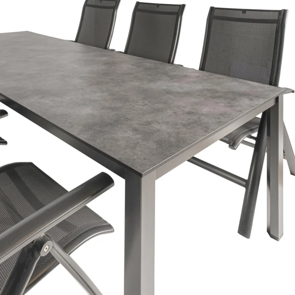 De Kettler HPL 220 Legato 6 dining tuinset antraciet bestaat uit een HPL tuintafel en zes stapelbare Legato tuinstoelen. De tuintafel, vervaardigd van High Pressure Laminate (HPL), biedt uitstekende duurzaamheid en onderhoudsgemak, ideaal voor buitengebruik. Het aluminium Cubic onderstel combineert een tijdloos, modern ontwerp met een lichtgewicht constructie en is bestand tegen diverse weersomstandigheden en UV-straling, wat langdurige kwaliteit garandeert. De Legato tuinstoelen zijn stapelbaar en gemaakt van aluminium, met een zitting en rugleuning van textileen weefsel. Deze stoelen zijn weer- en UV-bestendig en zeer onderhoudsvriendelijk, perfect om de hele zomer buiten te laten staan.