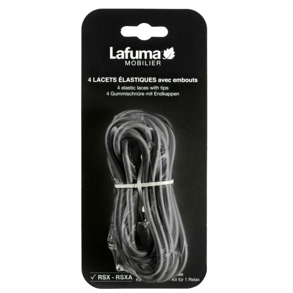 Deze Lafuma set van 4 elastieken met uiteinden zijn geschikt voor de RSX en RSXA relaxstoelen. De elastieken zijn makkelijk te vervangen voor nieuwe en zitten meteen stevig.