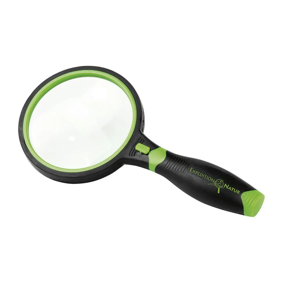 De Moses Verlag Expeditie Natuur loep heeft een ingebouwd lampje, waardoor u zelfs op donkere plekken kunt onderzoeken. Daarnaast vergroot het glas vier keer en wordt de loep geleverd met batterijen.
