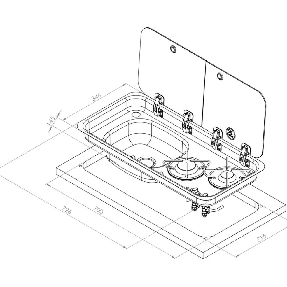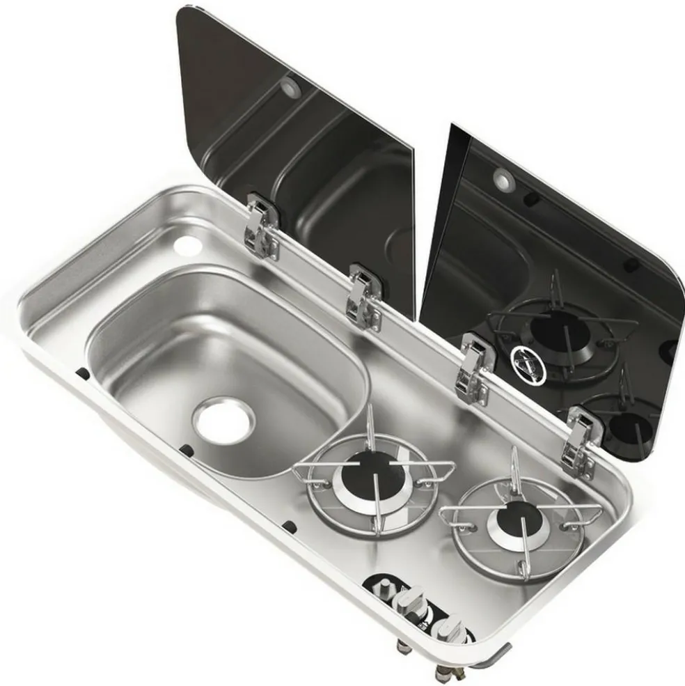 De Navy Load 2-pits kook-spoelcombinatie is vervaardigd uit roestvrij staal en heeft twee glazen afdekkappen. De spoelbak bevindt zich aan de linkerkant, terwijl aan de rechterkant twee branders zijn gemonteerd. Deze combinatie beschikt over een piëzo-ontsteking, maar wordt zonder waterkraan of afvoer geleverd.