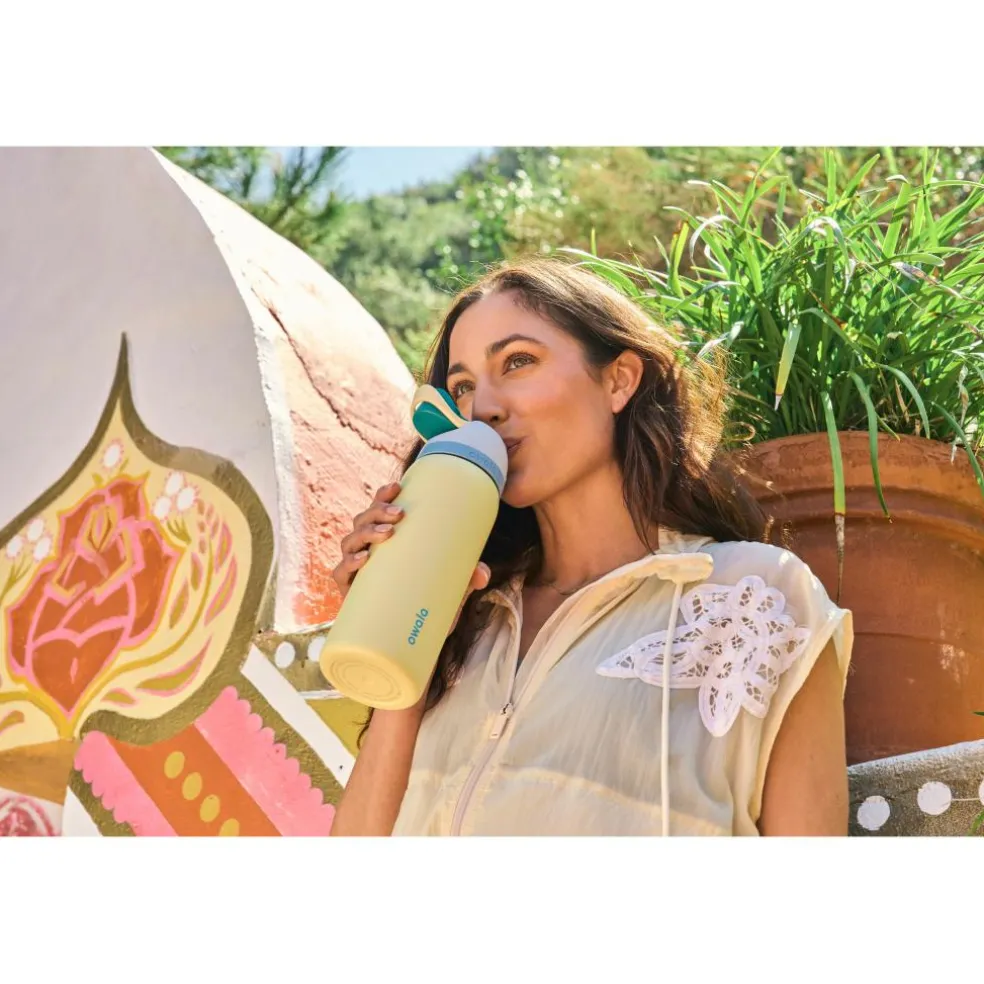 U kunt op twee verschillende manieren uit de Owala FreeSip drinkfles 945 ml sunny daze drinken. Deze drinkfles van Owala heeft een rietje en u kunt via de brede opening drinken. De deksel is door middel van een knop snel open te drukken en nadat u gedronken hebt, klikt u de deksel weer dicht. Ook zit er aan de deksel een handig handvat bevestigd. Deze lekvrije drinkfles houdt uw water 24 uur koel en heeft een brede opening waar u ijs aan uw water toe kunt voegen. Dankzij deze brede opening is de fles ook eenvoudig schoon te houden. De roestvrij stalen beker wast u met de hand af, de deksel en het rietje zijn vaatwasserbestendig. Bovendien is de tritan deksel vrij van BPA, Lood, en Ftalaat.