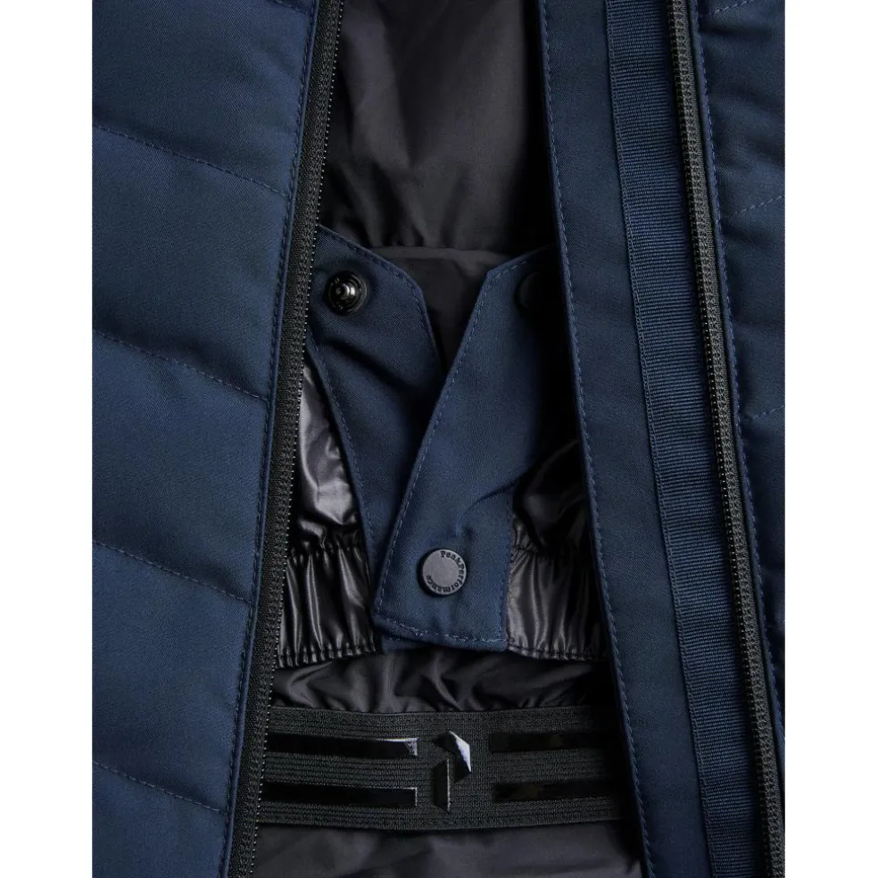 De pasvorm van deze Peak Performance Frost Ski Down winterjas is normaal en aanpasbaar bij de mouwen en aan de onderkant. De capuchon is verstelbaar en samen met een skihelm te dragen. Op de mouw zit een houder met rits voor een skipas en aan de binnenkant een ritszak voor belangrijke spullen. Ook is de jas voorzien van een sneeuwvanger met kliksysteem voor skibroeken.