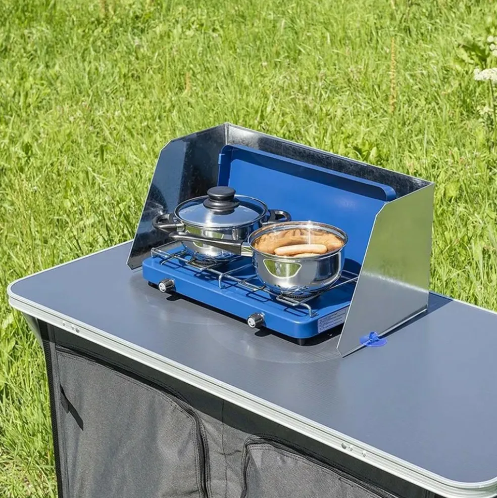 Het ProPlus kookwindscherm 3-delig is perfect voor op de camping en geschikt voor gas- en elektrische kooktoestellen. Het universele windscherm is verstelbaar in breedte van 38,5 tot 73 centimeter en eenvoudig te bevestigen met 4 zuignappen. Inclusief twee uitsparingen voor een gasslang of elektrakabel.