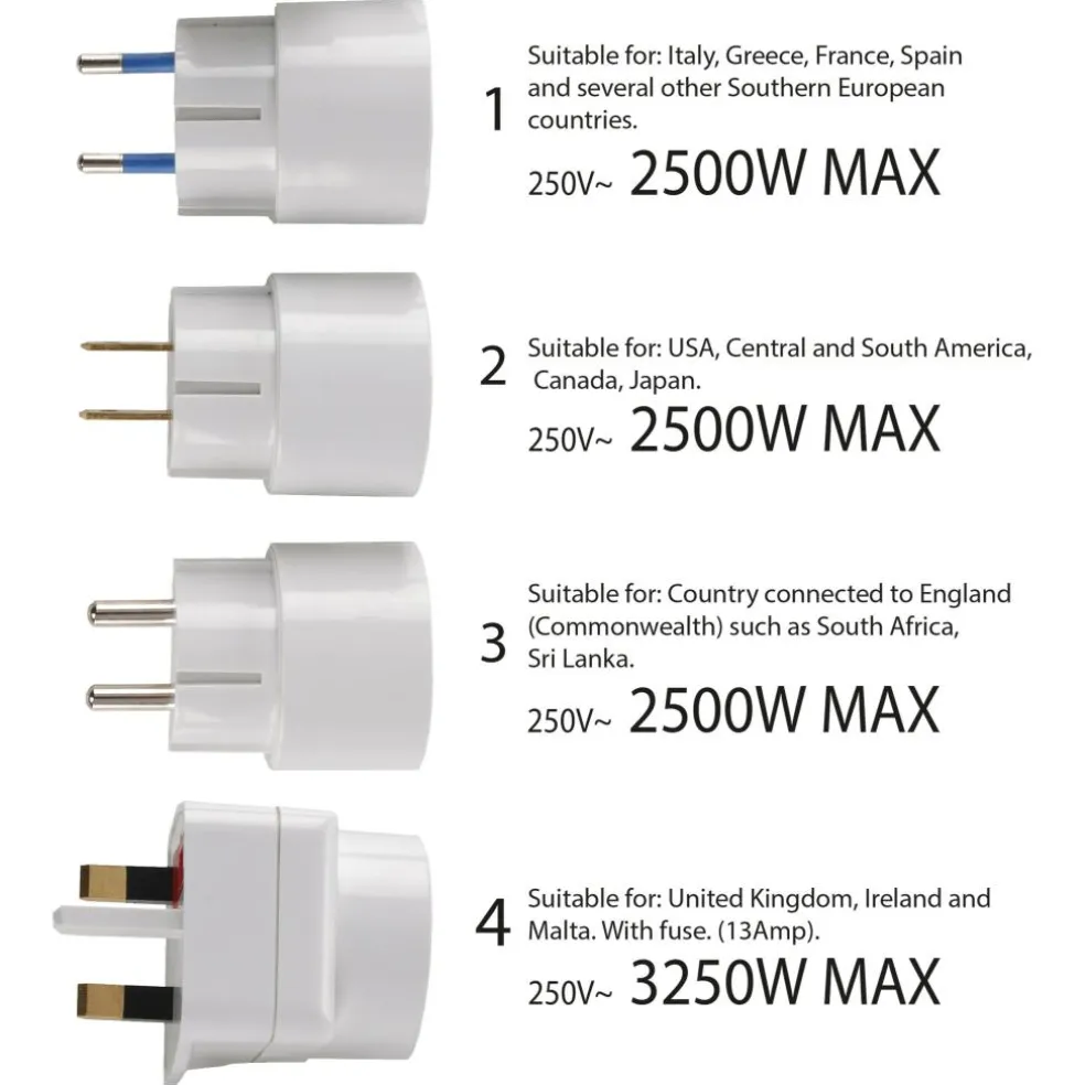 Deze Q-Link reisstekkerset bestaat uit vier stekker die ieder in een bepaald land of werelddeel te gebruiken zijn.