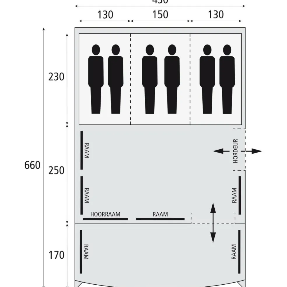 De Pacific Reef 430 TC is ontworpen voor gezinnen of vriendengroepen tot zes personen. De slaapcabines hebben een lengte van 230 cm en donkere binnententen voor meer rust in de vroege ochtend. Met wegritsbare scheidingswanden deelt u de binnentent flexibel in tot drie aparte slaapvertrekken (230 x 130 cm, 230 x 150 cm en 230 x 130 cm), zodat ieder zijn eigen plek heeft. De rechte wanden leveren extra stahoogte: circa 200 cm achterin en 220 cm in het midden en voorin, wat prettig is bij omkleden of wanneer u een keukenkastje of kast plaatst. De leefruimte meet 250 x 430 cm en kan, dankzij de wegrolbare voorwand, in een handomdraai worden verlengd tot een open veranda. Slim geplaatste opbergvakken houden kleine spullen binnen handbereik, terwijl de zij-ingang snelle toegang biedt zonder de hele voorkant te openen.