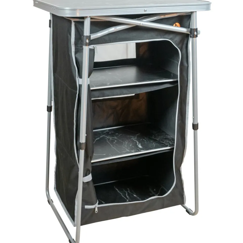 De Safarica Sabie campingkast is een snel opzetbare campingkast met 3 vakken en een topblad. Het topblad en de legplanken zijn van kunststof. Het doek is van polyester. Aan de achterkant van deze Safarica campingkast is mesh gebruikt voor ventilatie. De kast kan worden ingeklapt en worden meegenomen in de meegeleverde draagtas.