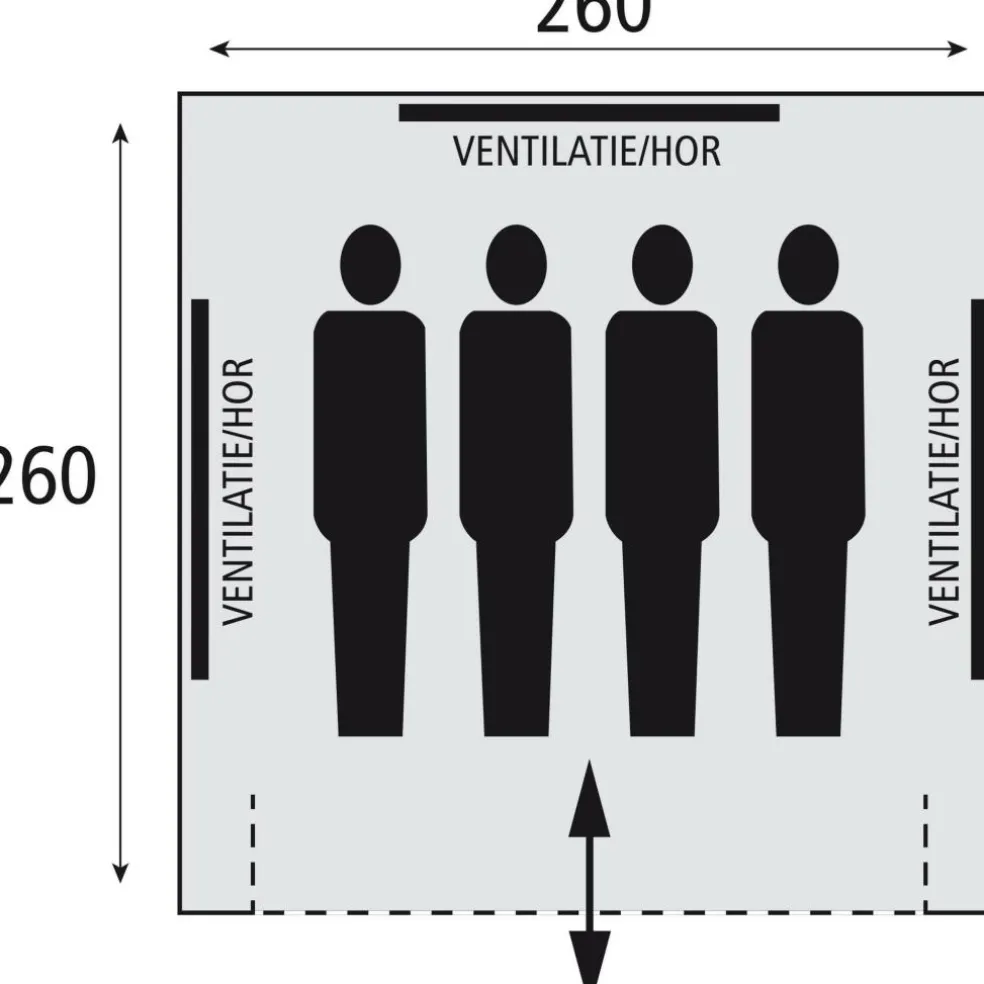 - Afmeting 260 x 260 cm: ruimte voor 2 kampeerders met bagage of 3 tot 4 slaapplekken met matjes.