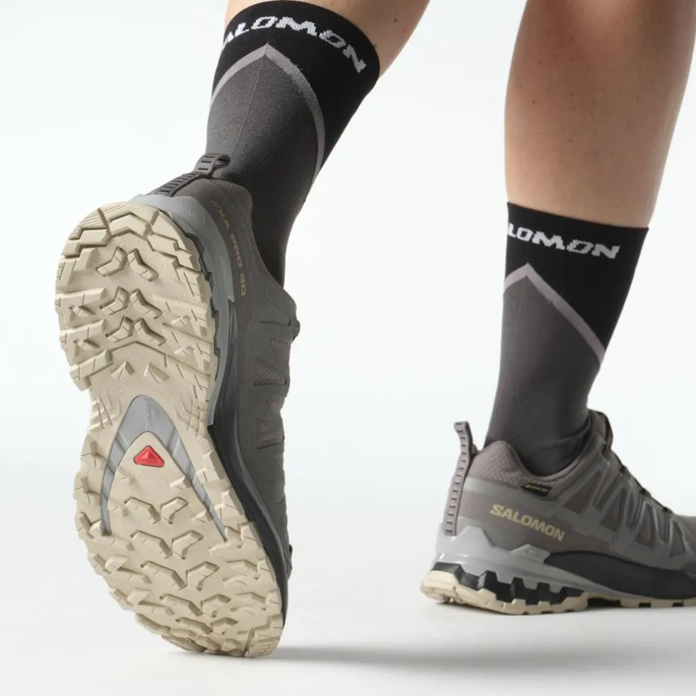 De Salomon XA PRO 3D V9 GORE-TEX hardloopschoenen zijn ontworpen om extreme omstandigheden aan te kunnen en bieden optimale prestaties in ruig, rotsachtig gebied. Het 3D Advanced Chassis dat zich tussen de buiten- en tussenzool bevindt, zorgt voor extra stabiliteit, controle en bescherming tijdens trailrunning. Voor extra veiligheid is de neus van de schoen uitgerust met een verstevigde teenkap, die bescherming biedt tegen stoten. Daarnaast zorgt het GORE-TEX membraan ervoor dat de voeten onder alle weersomstandigheden droog en comfortabel blijven. De innovatieve Contagrip buitenzool heeft een speciaal noppenpatroon die uitstekende grip biedt op zowel droge als natte ondergronden.