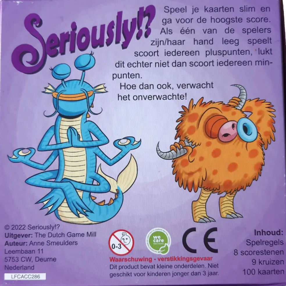 Het Seriously!? Familie bordspel is een snel en leuk kaartspel wat veel speelplezier creëert voor de hele familie. Ga voor de hoogste score door kaarten te spelen waarbij u uw scoresteen kunt verplaatsen. Maar pas op! De manier waarop het spel eindigt bepaalt of uw scoresteen plus- of minpunten waard zijn. Dit spel staat garant voor veel speelplezier aan 2 tot 8 spelers.