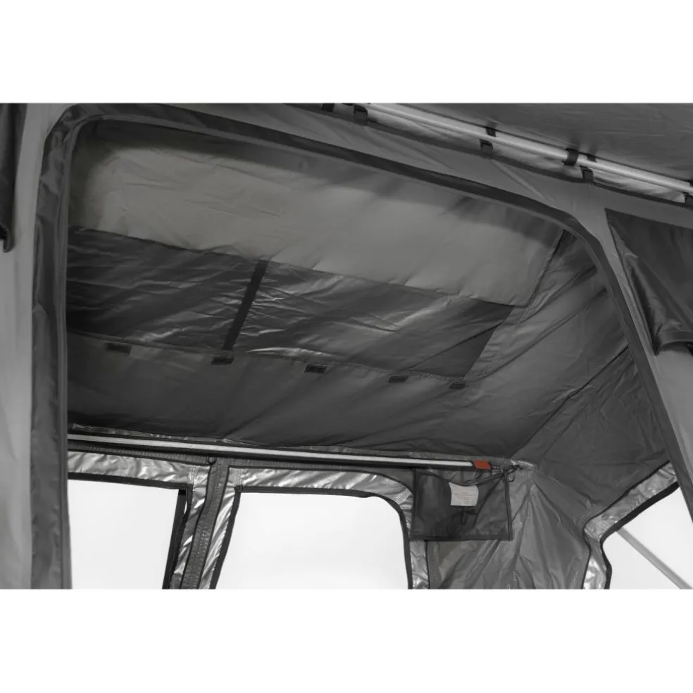 - Compact op het dak: ingeklapt 218 x 152 x 25 cm – laag profiel voor stiller rijden. Open 218 x 152 x 145 cm voor aangenaam zit- en leefcomfort.