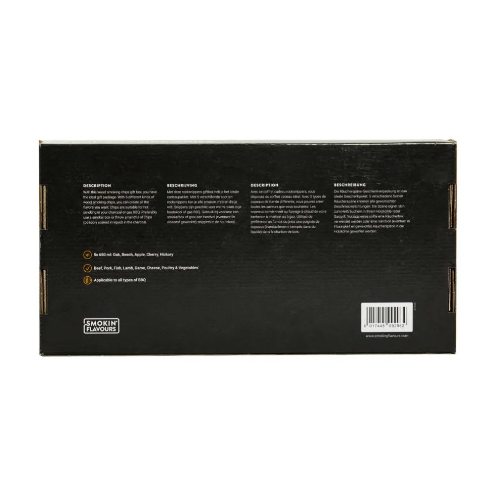 Deze Smokin’ Flavours rooksnippers geschenkset heeft 5 verschillende rookhout smaken om te kunnen uitproberen. Zo zijn de snippers geschikt voor warm roken in uw houtskool of gas barbecue.