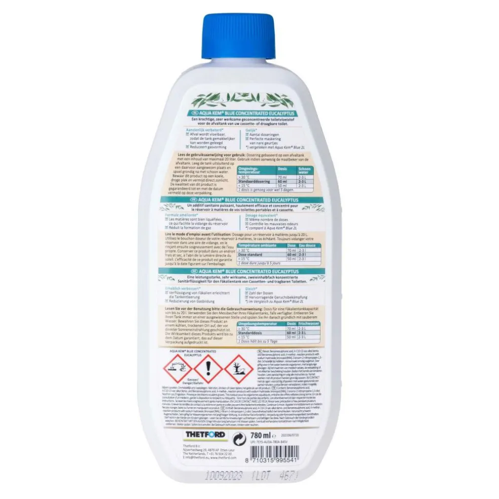 De Thetford Aqua Kem Blue Concentrated eucalyptus 780 ml heeft een frisse eucalyptus geur met een beetje mint. De Thetford toiletvloeistof is extra geconcentreerd en houdt uw toilet tot 5 dagen fris met één dosering. De kleine fles is gemakkelijk op te bergen en weegt niet veel.
