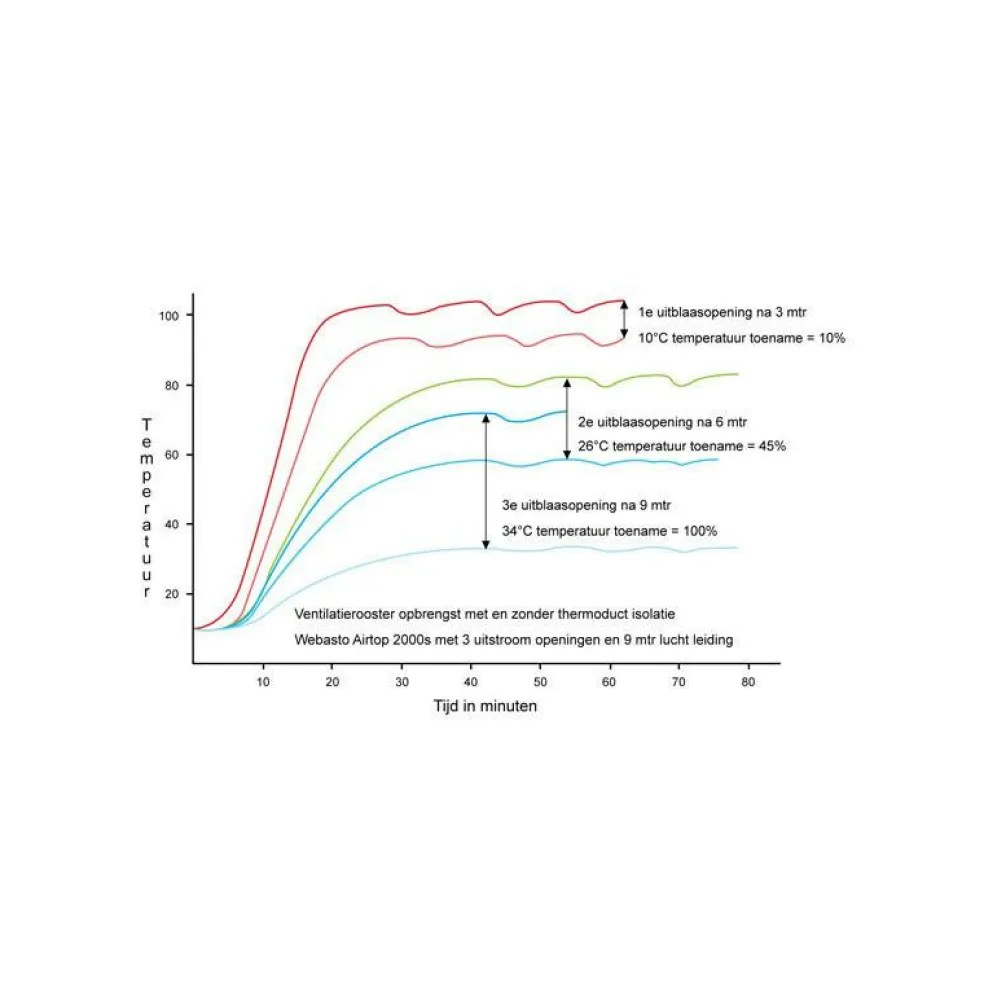 Er gaat veel warmte van luchtverwarmers verloren via het luchtleidingsysteem. De leidingen lopen vaak door ongebruikte ruimtes zoals ondervloeren en achter de betimmering. Hier gaat veel kostbare warmte verloren. Door het Webasto Thermoduct isolatiesysteem te gebruiken wordt het temperatuurverlies in de leidingen tot een minimum teruggebracht. Hierdoor wordt de effectieve opbrengst van de kachel beter benut. Met als gevolg dat de brandtijd wordt verkort en het brandstofverbruik verminderd. Ook is het mogelijk om langere warme luchtleidingen aan te leggen. Tests hebben aangetoond dat isolatie met Webasto Thermoduct de effectiviteit bij de uitblaasmond bijna kan verdubbelen. Met Thermoduct wordt ook de veiligheid verhoogd. Het verlaagt de temperatuur van de luchtslang van circa 100°C tot nog slechts 30°C. Het Thinsulate materiaal is bestand tegen temperaturen tot 140°C.