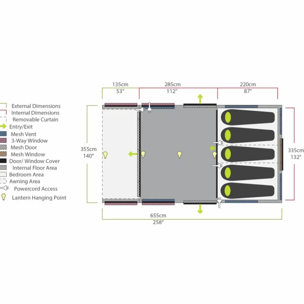De totale tentmaat is 655 x 355 cm, met een pakmaat van 71 x 46 x 46 cm en een gewicht van 31,5 kg. Dit maakt de EVO TL V2 een volwaardige familietent die goed te hanteren blijft bij vervoer en opzetten. Zo krijgt u de ruimte en het gemak van een grote opblaasbare tunneltent, zonder onnodige complexiteit.